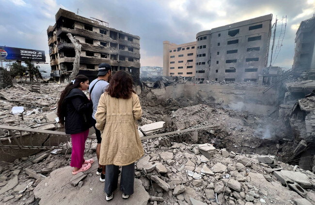 People look at destroyed buildings hit by Israeli airstrikes in Dahiyeh, Beirut, Lebanon. Alamy Stock Photo