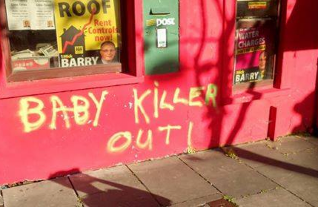 Mick Barry, who is a member of the Anti-Austerity Alliance, shared a photograph of his office with the words “Baby Killer Out” sprayed on an outside wall today.