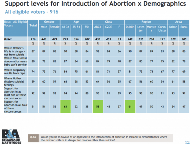 This table breaks down support for abortion among males and females, age groups, social classes and location: