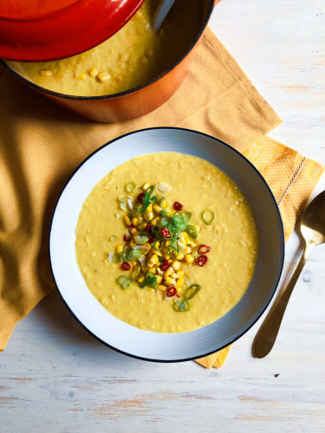 5. When ready to serve, pour into bowls, topping with the fresh sweetcorn, sliced spring onion, red chilli and a drizzle of chilli oil, if you like.
