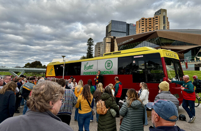 Logos for the Wallabies and the British & Irish Lions nations plastered along the sides were a strong hint as to what it’s all about. 15 members of the local Brighton rugby club will be driving the bus from Adelaide to Melbourne for the second Lions Test, then onto Sydney for the third Test, before returning home.