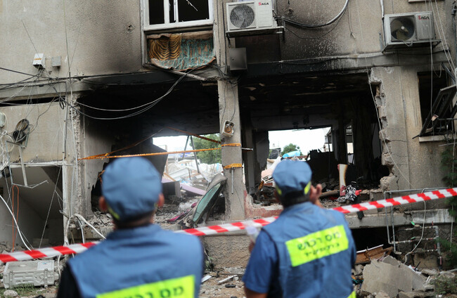 Emergency service members inspect the damage to a residential building which was hit by rockets fired from Gaza in Ashkelon, Israel, yesterday. Alamy