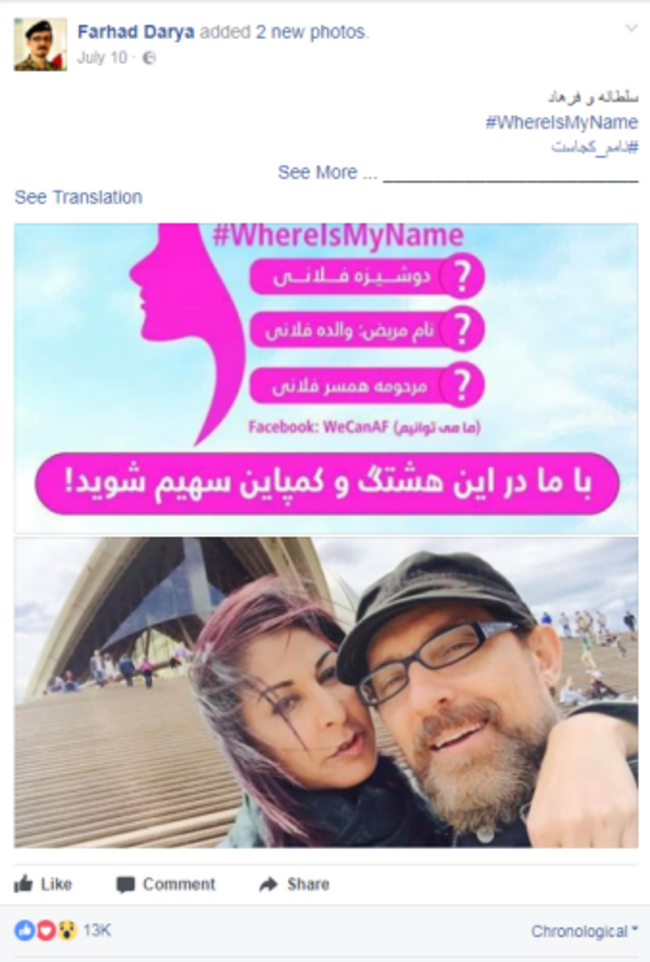 The campaign received a boost when hugely popular Afghan singer Farhad Darya posted a photo of himself and his wife online alongside both their names.