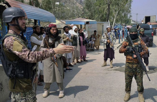 A Pakistani paramilitary soldier and Taliban fighters standing guard at a border crossing point between Pakistan and Afghanistan. AP/PA Images