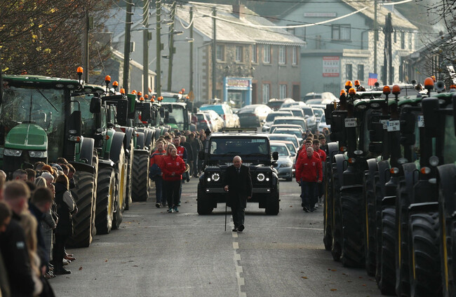 Ahead of Mr McCluskey’s funeral in Drumconrath, dozens of tractors lined the main street and crowds gathered.