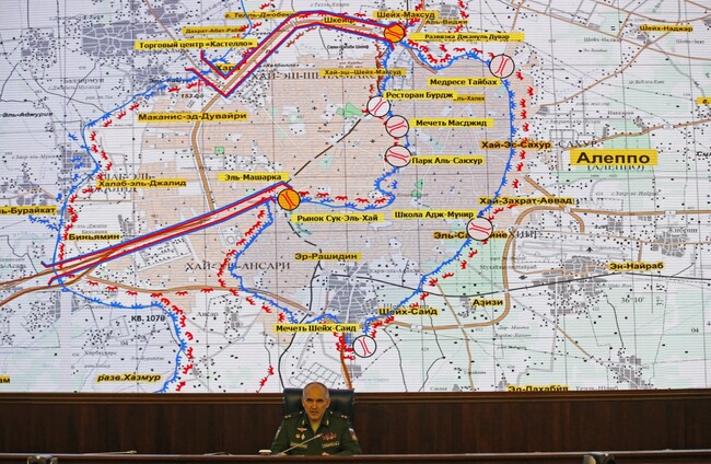 Lt. Gen. Sergei Rudskoi of Russia's military on front of a map of Aleppo. Alexander Zemlianichenko