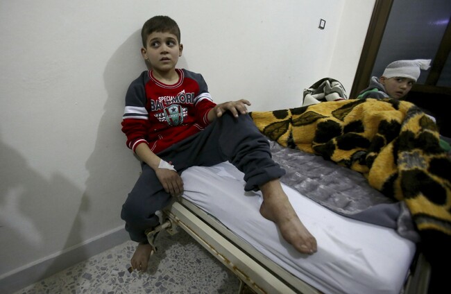 Syrian boys, evacuated from Aleppo, sit in a field hospital bed near Idlib, Syria. AP/Press Association Images