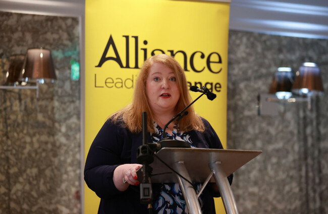 Alliance leader Naomi Long speaking during the party's General Election manifesto launch today Alamy Stock Photo