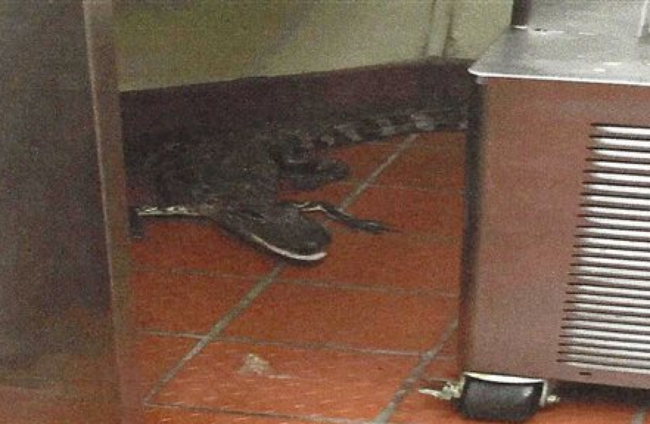 This photo provided by the Florida Fish and Wildlife Conservation Commission shows an alligator in the kitchen of a Wendy's Restaurant in Loxahatchee. Florida Fish and Wildlife Conservation Commission via AP