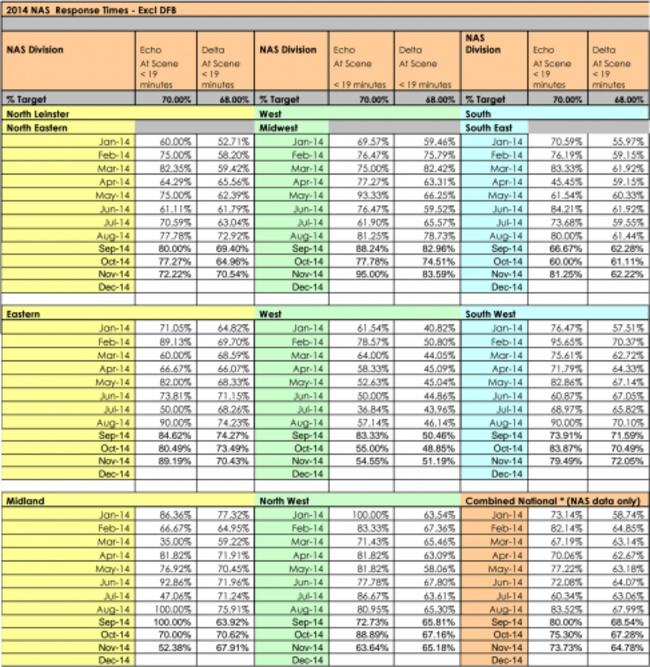 The table below shows National Ambulance Service response times for both ‘Echo’ and ‘Delta’ calls. An ‘Echo’-class call relates to patients suffering from a life-threatening emergency like a cardiac or respiratory arrest.
