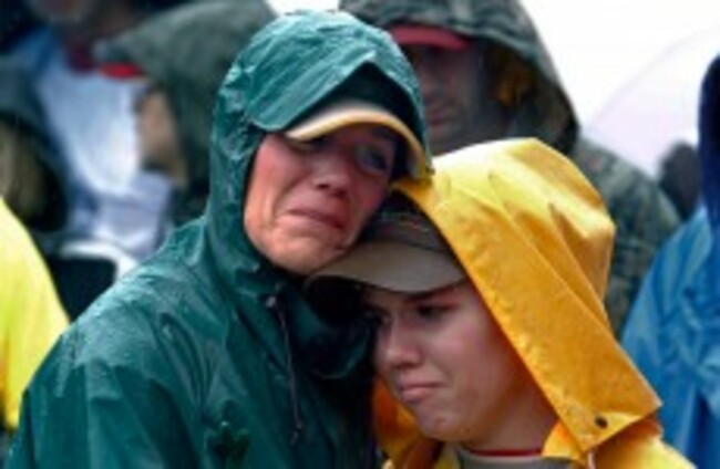 Joan Olsen, left, and her daughter Emily Olsen embrace at the start of the Walk for Suicide Awareness in Kaukauna, Wisconsin. Joan and Emily were honoring Chris Olsen, who was Joan's husband and Emily's father. AP Photo/Post-Crescent Media, Dan Powers