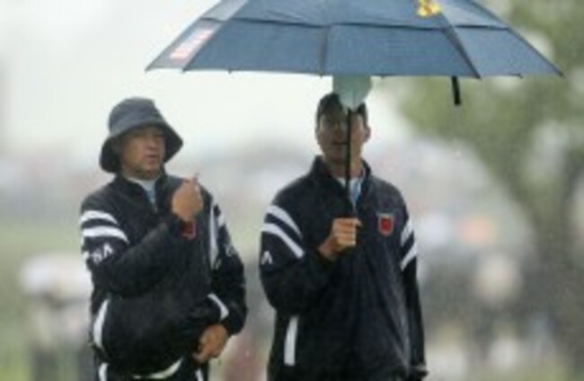 Davis Love III and Matt Kuchar of USA walk back to the clubhouse after play was suspended at 10am this morning. INPHO/Cathal Noonan