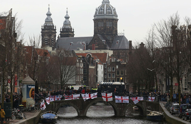 AMSTERDAM POLICE SAY they arrested almost 100 England football supporters ahead of a friendly international against the Netherlands yesterday, with videos posted online showing crowds packing the narrow streets and bridges in the canal city, singing and cheering.