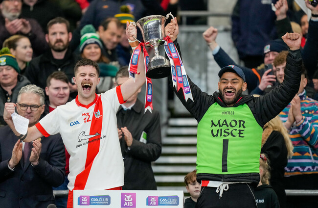 dara-o-cinneide-selector-and-eanna-o-conchuir-at-full-time Cathaoirleach An Ghaeltacht CLG, Dara Ó Cinnéide, ag ceiliúradh bua an chumainn le hÉanna Ó Conchúir tar éis gur séideadh an fheadóg deiridh. James Lawlor / INPHO James Lawlor / INPHO / INPHO