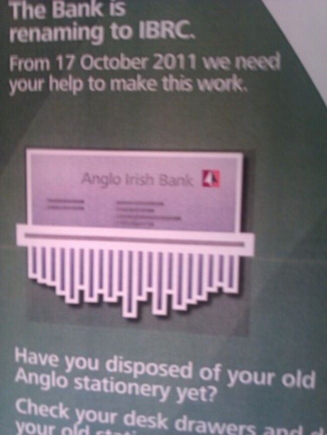 This is a poster that has appeared inside the bank’s offices this week, advising staff to get rid of “your old Anglo stationery”: