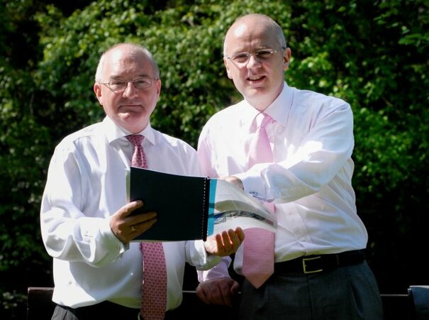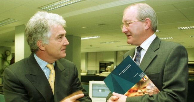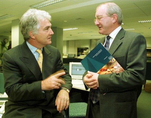 In happier times, reporting Anglo results in 1999 are Seán Fitzpatrick and Willie McAteer Photocall Ireland!