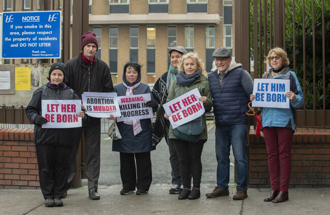 People stage a protest against abortion at the gates of Our Lady of Lourdes Hospital today. Ciara Wilkinson