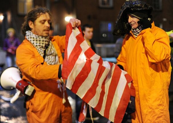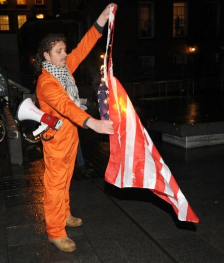 Protesters burn a US flag as they are stopped from marching to Dublin Castle to protest against US Secretary of State Hillary Cinton's visit. (Pic: Laura Hutton/Photocall Ireland)