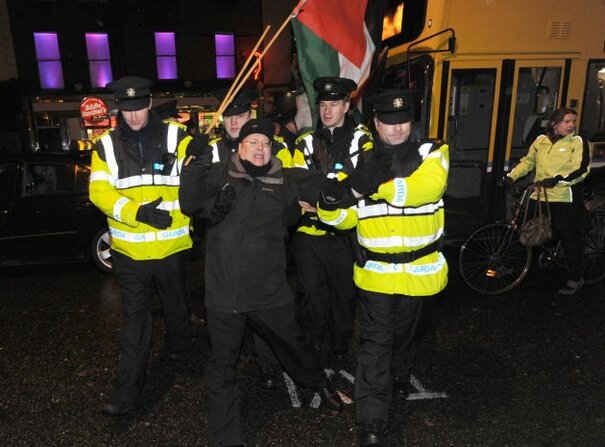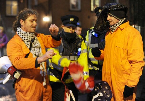 Gardaí stop Irish anti-war protesters burning an American flag (Pic: Laura Hutton/Photocall Ireland).