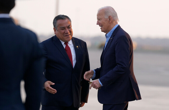 US President Joe Biden greets Peru's Prime Minister Gustavo Adrianzen as he arrives at Jorge Chavez International Airport in Lima, Peru. Alamy Stock Photo