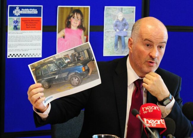 Detective Superintendent Reg Bevan holding up a photo of the land Rover belonging to 46-year-old Mark Bridger who has been arrested following the abduction of April Jones. (Rui Vieira/PA Wire)