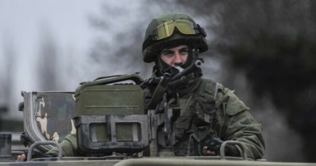 A man in unmarked uniform looks from atop of a military vehicle while standing guard as troops taking control the the Coast Guard offices in Balaklava AP Photo/Andrew Lubimov