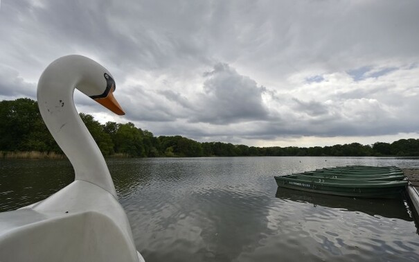 The swan neck of a pedal boat waiting for customers is seen at an empty lake under a cloudy sky in Gelsenkirchen, Germany.Source: AP/Press Association Images