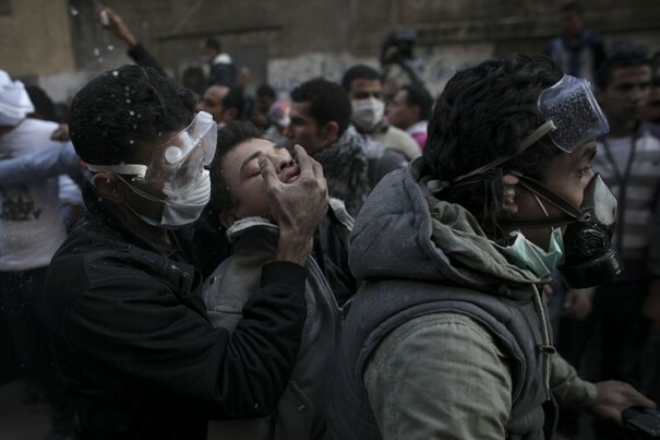 A protester overwhelmed by tear gas is aided by two men on a motorcycle during clashes with Egyptian riot police near Tahrir Square in Cairo today. (AP Photo/Tara Todras-Whitehill/PA Images)