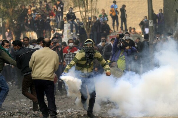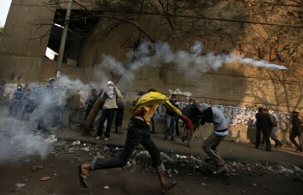 A Protester throws a tear gas canister away during clashes with the Egyptian riot police near Tahrir Square. (AP Photo/Khalil Hamra/PA Images)