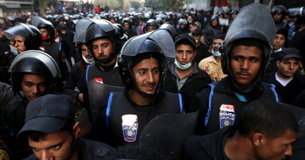Egyptian riot police stand guard during today's clashes near Tahrir Square. (AP Photo/Khalil Hamra/PA Images)