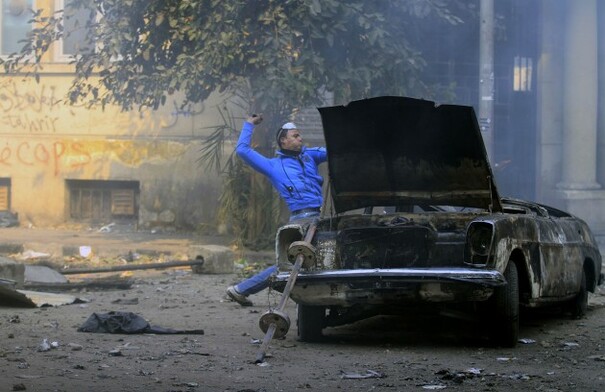 A protester throws stones during clashes with the Egyptian riot police in Cairo. (AP Photo/Khalil Hamra/PA Images)