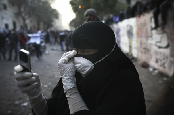 A veiled woman takes pictures with her mobile phone during clashes with Egyptian riot police in Cairo. (AP Photo/Tara Todras-Whitehill/PA Images)