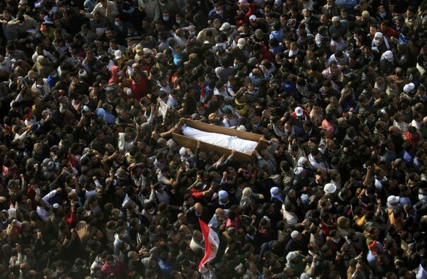 Egyptians at Tahrir Square carry the body of a protester killed in clashes with the Egyptian riot police during his funeral today. (AP Photo/Khalil Hamra/PA Images)