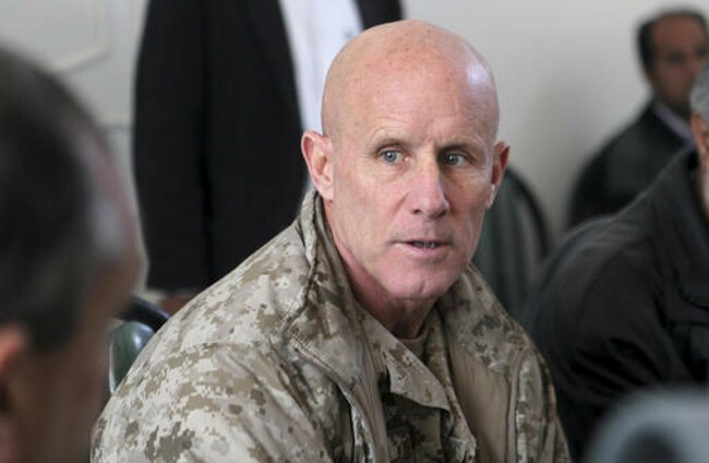 In this image provided by the U.S. Marine Corps, Vice Adm. Robert S. Harward, commanding officer of Combined Joint Interagency Task Force 435, speaks to an Afghan official. Sgt. Shawn Coolman/U.S. Marine Corps via AP