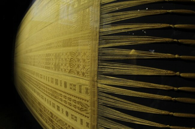 A spider silk shawl, designed by Simon Peers and Nicholas Godley, is seen on display at the Victoria and Albert Museum in London. The shawl is woven and embroidered in Madagascar and is made from the silk of more than a million female Golden Orb Weaver spiders collected in the highlands of Madagascar. The hand-woven textile is naturally golden in colour and took over four years to create. (AP Photo/Sang Tan)