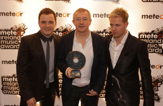 Shane Filan (L) and Nicky Byrne (R) of Westlife with manager Louis Walsh (centre) at the Meteor Music Awards in 2009.