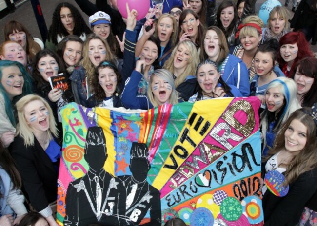 Jedward fans arranged to meet today via Jedward’s ‘Planet Jedward’ Twitter account and marched around Dublin to show their support for the brothers ahead of tonight’s Eurosong contest. (Mark Stedman/Photocall Ireland)