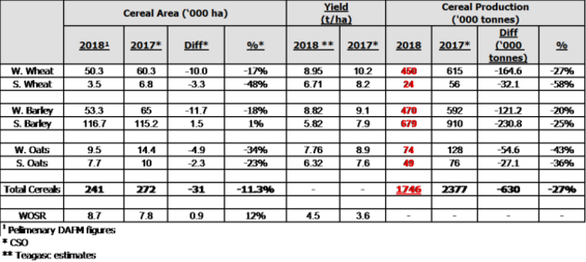 “A large decrease in the yields of spring crops is expected in 2018. Spring barley yields will be halved in many cases, with the average yields predicted to be 26% lower,” Michael Hennessy, of Teagasc, explained.