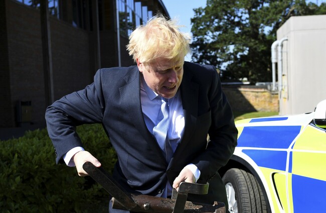 Boris Johnson holds a battering ram during campaigning. Dylan Martinez/PA Images