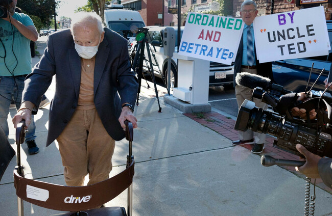McCarrick, 91, wore a mask and entered Boston’s Dedham District Court hunched over a walker. “Shame on you!” a protester shouted.