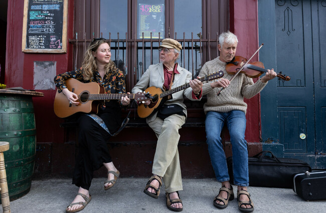 DK09092024 CorkFolk 003 Musicians Meadhbh Hayes, Jimmy Crowley and Ger Wolfe launching the 45th Cork Folk Festival, which will be held from 2-6 October.