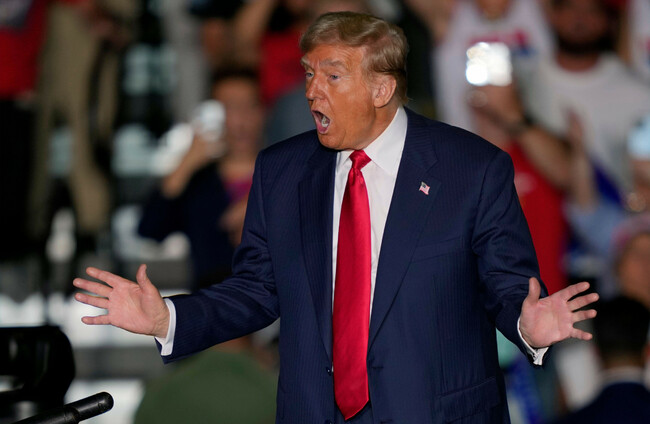 Republican presidential nominee former President Donald Trump gestures to supporters at a campaign rally at Greensboro Coliseum, Tuesday, Oct. 22, 2024, in Greensboro, N.C. Alamy Stock Photo