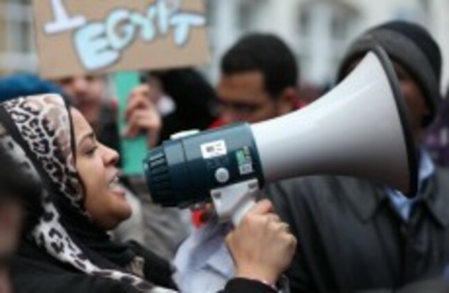 Egyptian citizens and supporters gathered outside the Egyptian Embassy in London to show solidarity to the protesters in Egypt, 1 Feb 2010