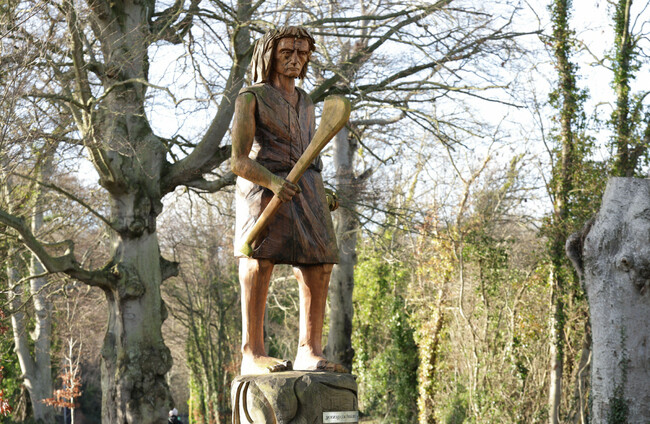 A large tree trunk carved wooden sculpture of young Cu Chulainn with hurley stick and sliotar on a woodland road leading in to Saint Catherine's Park in Lucan in December. Alamy Stock Photo