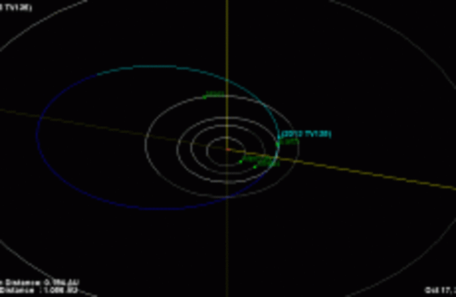 This diagram shows the orbit of asteroid 2013 TV135 (in blue), which has just a 1-in-63,000 chance of impacting Earth. NASA