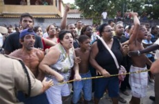 People react to a person in a police car, not seen, who they mistook for a suspect, as they stand behind police tape after a school shooting in Rio de Janeiro, Brazil on Thursday. Associated Press
