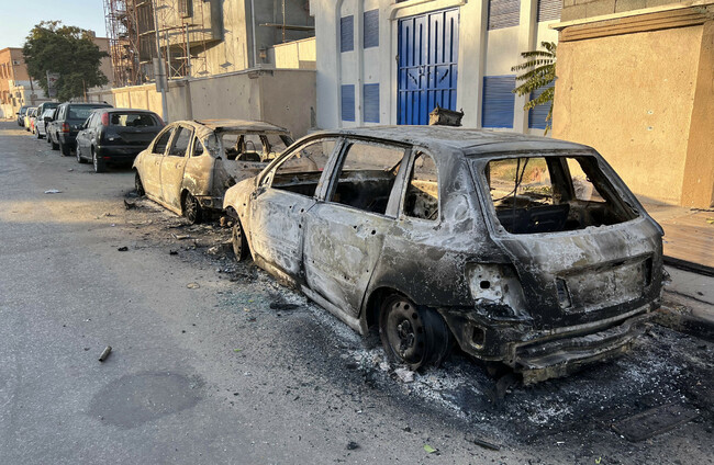 Damaged vehicles are seen after clashes in central Tripoli. Xinhua News Agency/PA Images