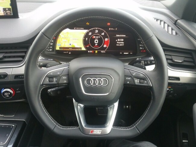 This particular model has plenty of option boxes ticked which sees exterior additions of an electric panoramic glass sunroof, Sepang Blue pearl effect paint, chrome package and 21-inch five twin-spoke Audi Sport cast aluminium alloys. The cabin is clad in Rotor Grey Silk Nappa leather with silver piping, the front sport seats are heated, and there is a reversing camera.