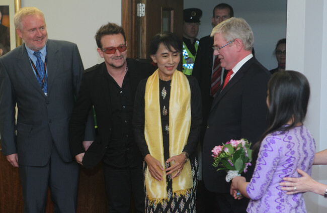 Suu Kyi with then Tanaiste and Minister for Foreign Affairs Eamon Gilmore (right), and U2's Bono after her arrival at Dublin Airport in 2012. Sasko Lazarov / Photocall Ireland Sasko Lazarov / Photocall Ireland / Photocall Ireland