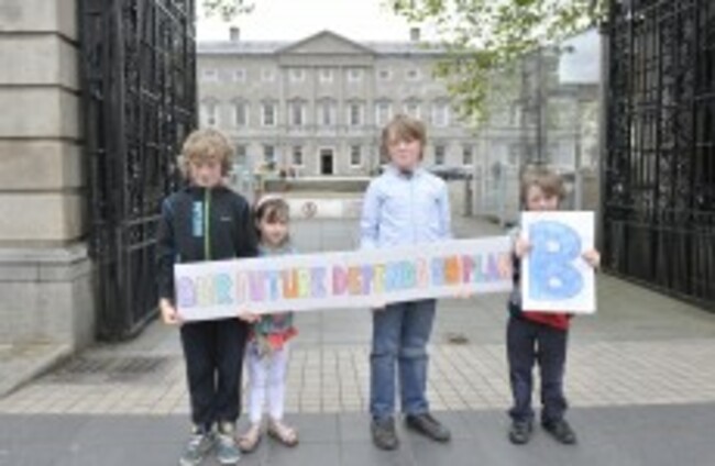 Luke O'Brien, 8, Faye O'Brien, 5, Rickard Donovan, 8, and Will Donovan, 6, at the launch of the Plan B campaign outside Leinster House yesterday. Sasko Lazarov/Photocall Ireland
